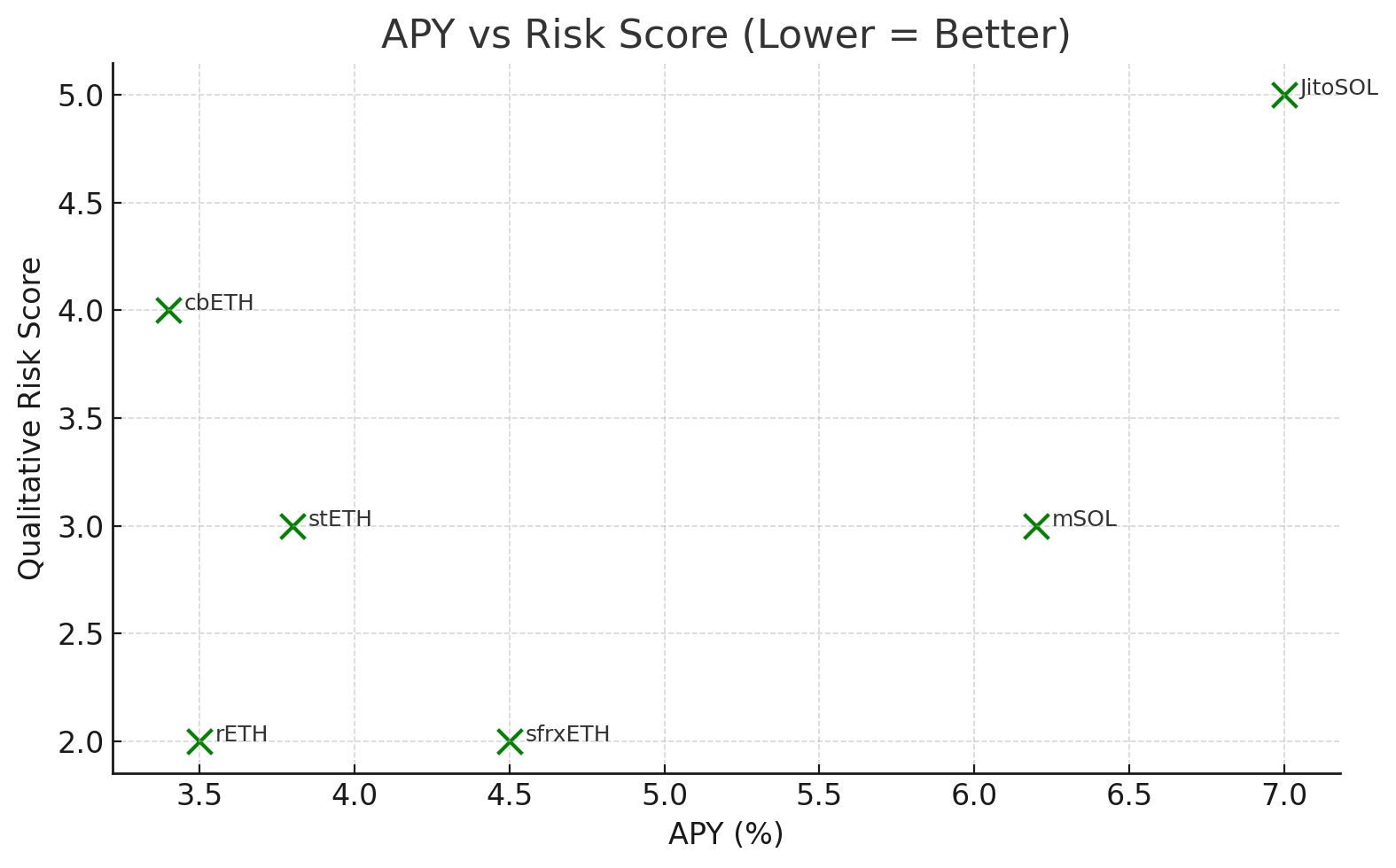 - sfrxETH appears optimal with relatively high APY and low risk