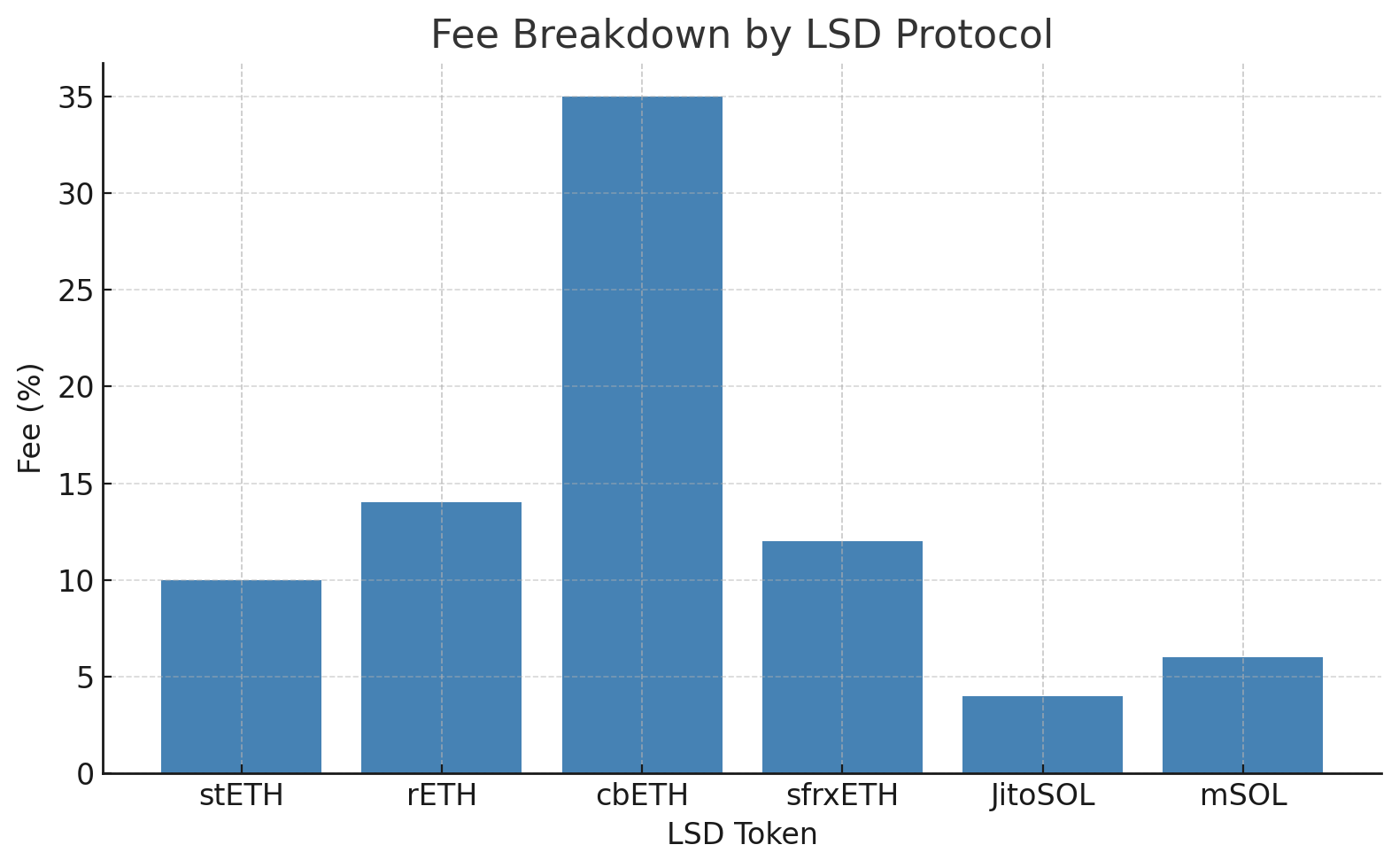 This figure shows fee breakdown by LSD protocol. It visualizes how much each protocol charges in staking or validator fees. Notably: