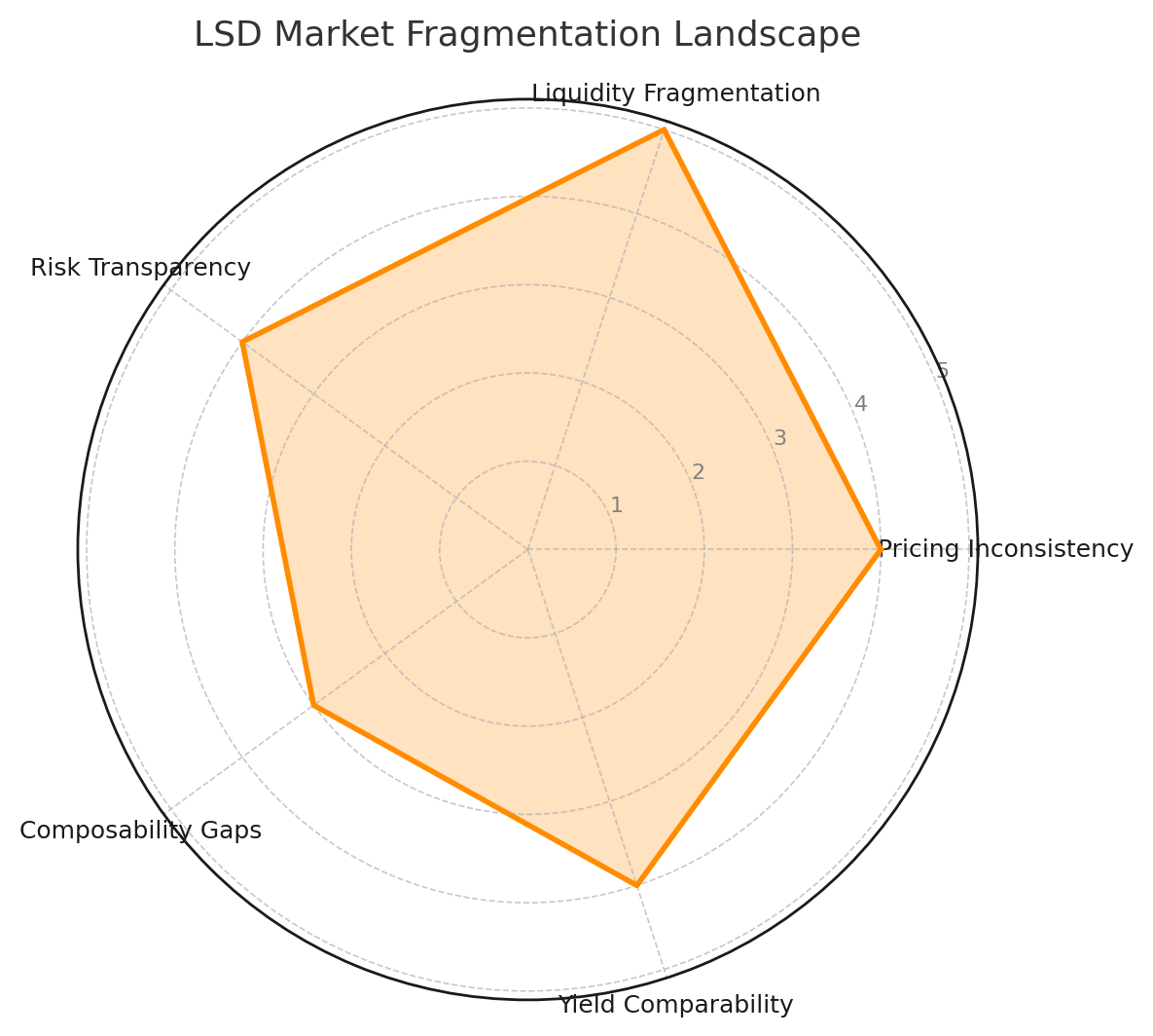 Thsi figure is the LSD Market Fragmentation Landscape radar chart. It visually maps key pain points in the current LSD ecosystem: