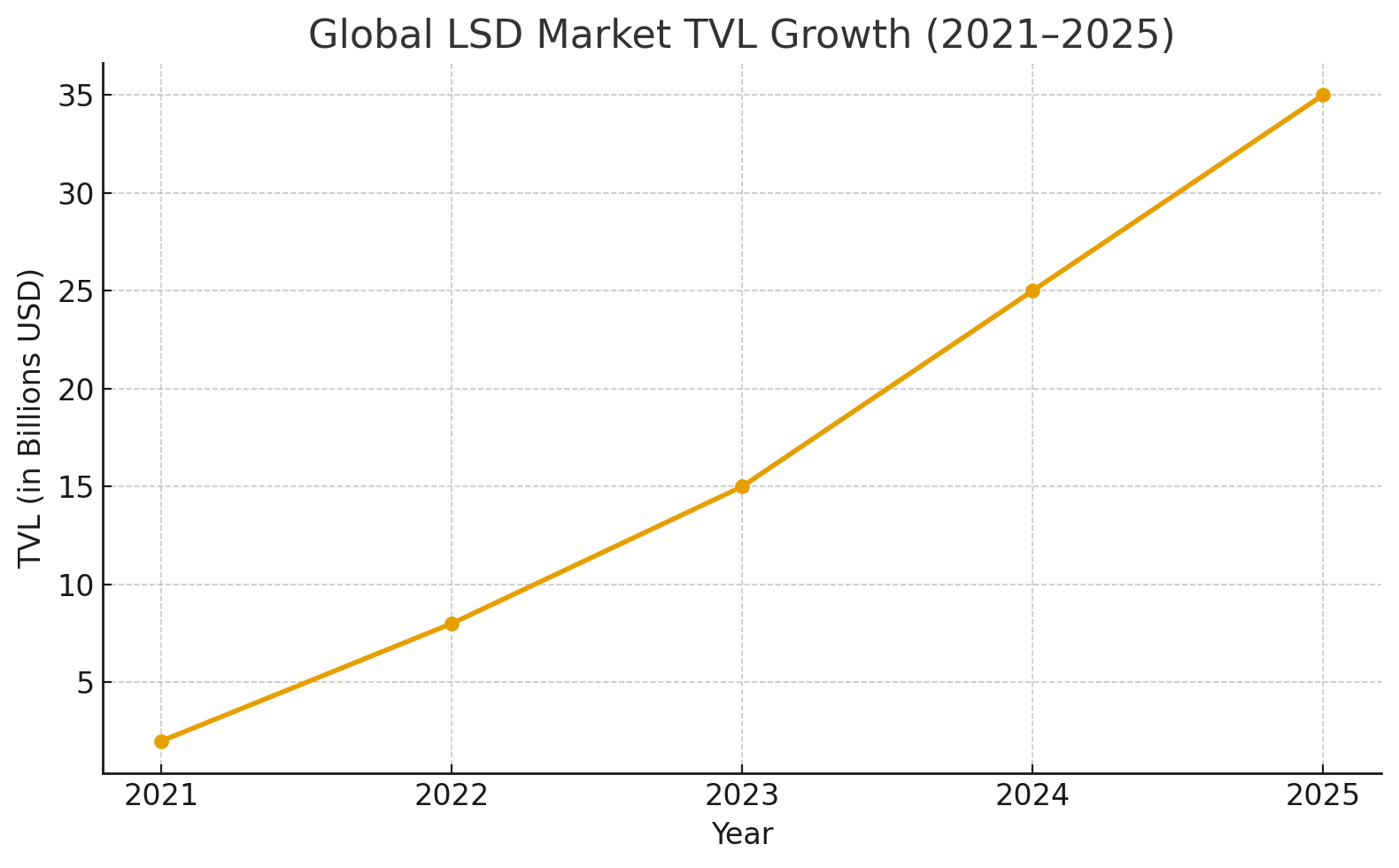 - TVL Expansion: LSD TVL has grown from ~$2B in 2021 to over $35B by 2025.